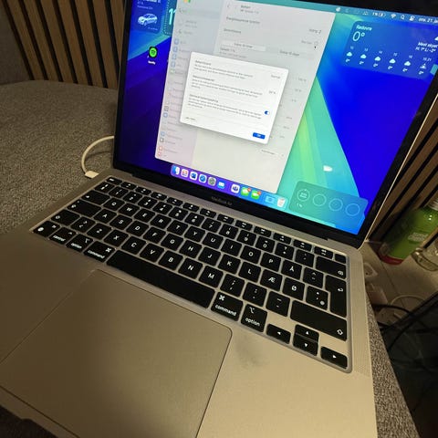 Den kommer med original oplader samt nyeste macOS Tahoe