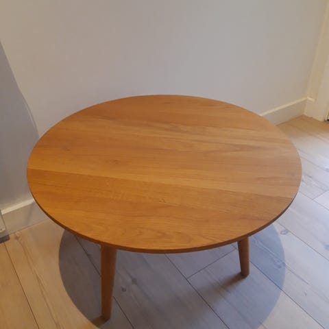 Sofabord i massivt egetræ. Rundt bord med 4 ben, udført i ubehandlet eg med synlig årestrukturer egnet til stue, soveværelse eller entré. Bordet er snedkerfremstillet med fokus på en enkel, funktionel form og naturpræget overflade i en klassisk nordisk stil.