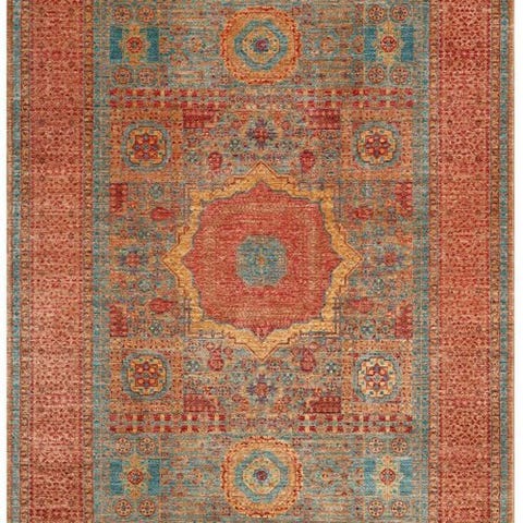 Et pragtfuldt håndknyttet designer tæppe i det elegante Mamlouk-design, fremstillet med enestående præcision og kunstnerisk finesse. Dette mesterværk imponerer med sit komplekse geometriske mønster, der stråler i harmoniske blå, grønne, røde og gyldne nuancer og skaber en fascinerende dybde.