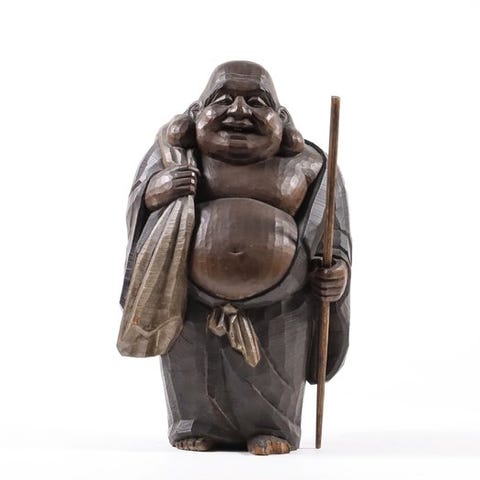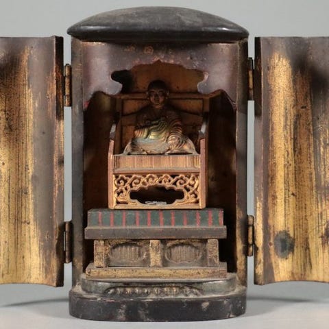 Antik træs sculpture fra Edo-perioden med et bronz镜 af Fujiwara Mitsumasa (藤原光政) fra Japan, ca. H 42 cm × B 21 cm × D 7,7 cm, i rimelig stand med en revne i Buddha-statuebasen og insektskader på den ene side, ikke underskrevet. Klik på den blå "gå til varen" knap, for at købe eller byde på denne vare. Den samlede pris vil blive vist inden du afgiver dit bud.