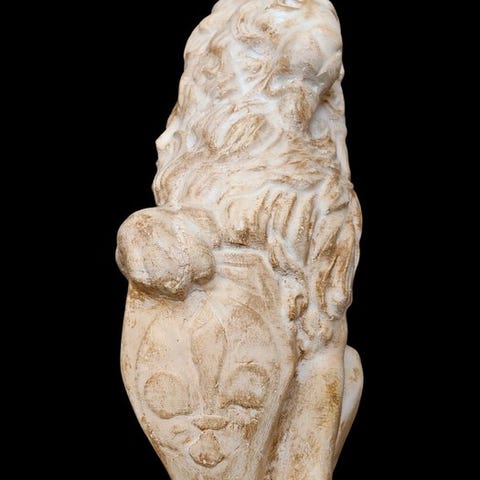 Skulptur af mineralsten med titel 'Leone Vegliante' fra Italien, i god stand, mål 30 x 16 x 14 cm, vægt 5 kg, beige, ubesignet. Klik på den blå "gå til varen" knap, for at købe eller byde på denne vare. Den samlede pris vil blive vist inden du afgiver dit bud.