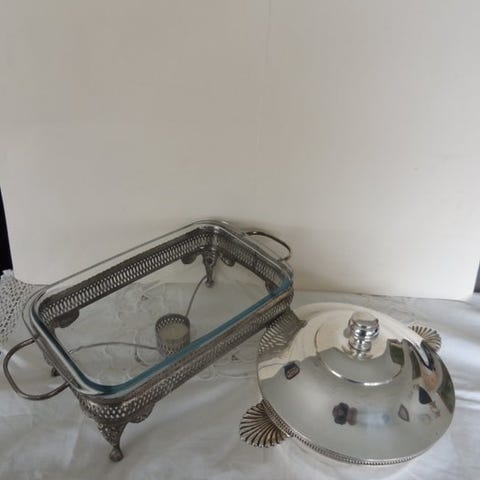 Stor rechaud sølvbelagt (med Marinex ovnfast fad), inklusive glas te-lysestager.