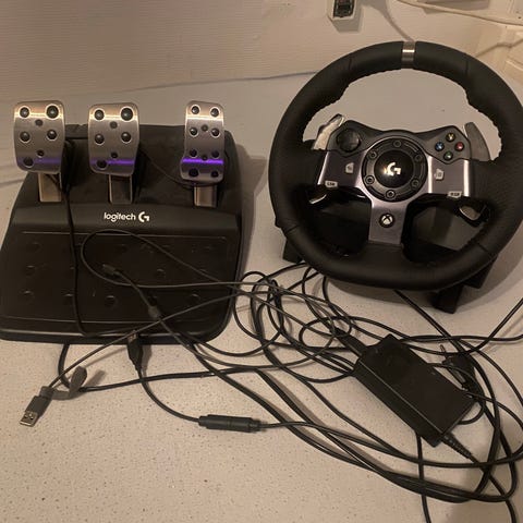 Logitech G920 Racingrat med pedaler, super stand virker ubeklageligt 😁 gemmer der sig en racerkører i dig er dette et super start sæt, det plug and play 👍