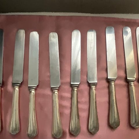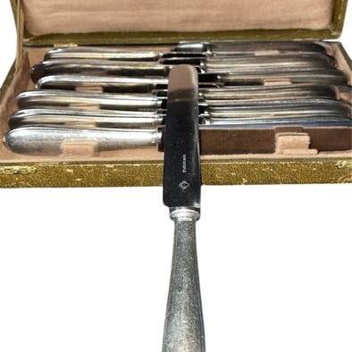 Til salg står seks spiseknive fra mærket Christofle fra Paris i Frankrig.