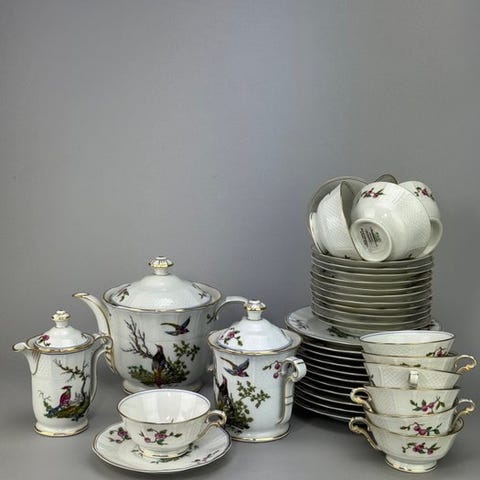 6 kopper og skåle / 6 små tallerkener / 1 sukkerkande med låg / 1 mælkekande / 1 tekande med låg / 1 serveringsfad