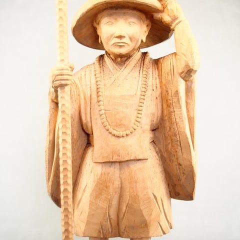 Dette er en siddende stenstatue af Kōbō Daishi 弘法大師 (Kūkai), oprindeligt et helligdom ved et helligsted, hvilket allerede gør det til et usædvanligt eksempel, da Kōbō Daishi primært er en buddhistisk skikkelse.