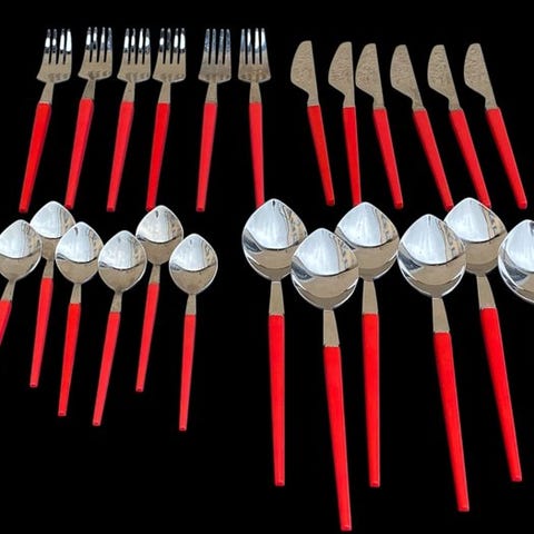 Ekstremt sjældent og enestående sæt bestik med 75 dele, produceret af den historiske italienske manufaktur Prandelli, der er synonym med pålidelighed, robusthed og overlegen kvalitet inden for bestik i det tyvende århundrede.