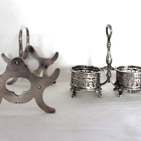 Et sæt bestående af 4 saleroner eller saltbøsser og peberkværn, lågene er gennemborede og skruede, i sølv 800‰ med hulsmærke i form af et vildsvinshoved. Skaftet er i presset krystalglas, fremstillet i Frankrig af det berømte sølvvarehus Christofle, grundlagt i det 19. århundrede og som har leveret til talrige kejserske, kongelige og prinsehov samt luksushoteller.