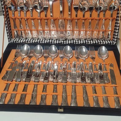 Frugtsæt Edoardo VII i sølvplet med engelsk mærke til tolv personer, med håndtag af perlemor i en todelt æske af rovere, silkefodret og fløjlforet. London, 1908, producent Goldsmiths & Silversmiths Co Ltd. Tilstand: gode, lette slidmærker på grund af alder. Mål på æsken: 30 × 24,5 × 6 cm. Smukt.