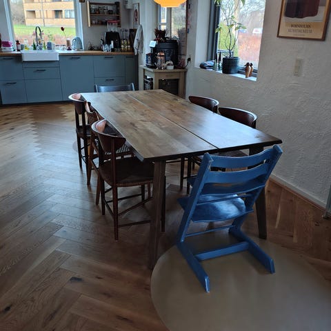 Plankebord i massiv eg med sorte stålben. Mærket jysk “ROSLEV” mulighed for tillægsplader.