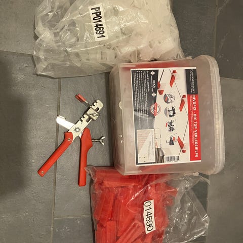 Har 14 poser nivellerings skruer og 3 poser møtrik, og mange andre brugte fliser møtrikker som du kan får med, og masser skibe al dem her kan du får for 1200, der er for over 2400