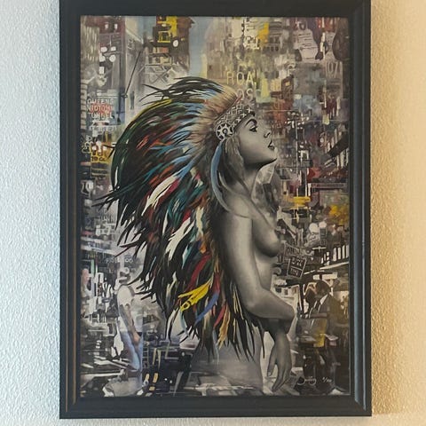 Guldborg kunsttryk med motiv af en engel i sort-hvid foran en farverig graffiti-baggrund. Limited edition nummer 9 af 100. Indrammet og velegnet til vægophæng.