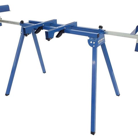 Kraftigt universalstativ fra Hyundai til alle kap- og geringssave. Den robuste konstruktion med en tung base giver stabil og plan støtte under arbejdet. Integrerede materialestop til hurtige og gentagne snit. Stativet er også udstyret med justerbare ruller med kuglelejer for nem materialefremføring. Nemt at folde sammen og ud. De sammenklappelige ben er udstyret med en brugervenlig fjederlås og skridsikre fødder. Skæredybder: Justerbar højde: 900-1000 mm Justerbar længde: 1160-2000 mm Belastning: max 150 kg Egenvægt: 13,4 kg