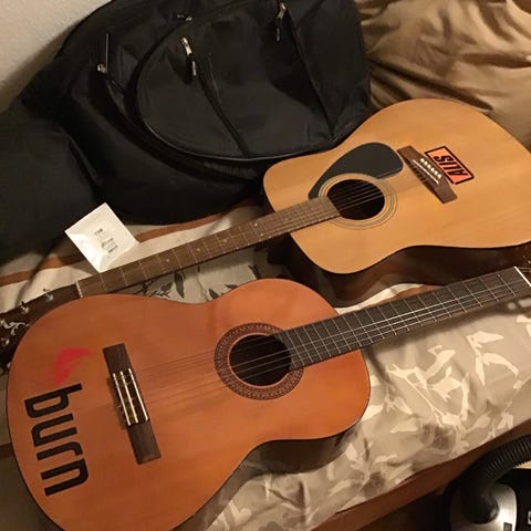 Medfølger guitarpose og nye strenge.