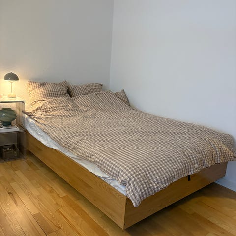Nypris: Seng 3800 kr., madras 4000 kr., lameller 300 kr. I alt 8100 kr.