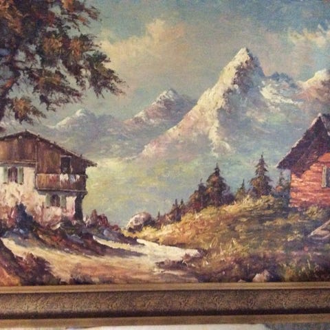 Maleri med motiv af et landskab med huse og træer. Maleriet måler cirka 110 cm i bredden og 78 cm i højden. Indrammet i en guldfarvet ramme.
