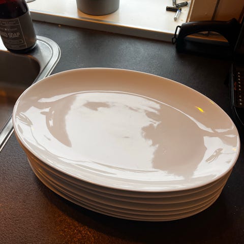12 hvide ovale tallerkner - de er intakte alle 12 med alm brugsspor - de kan også bruges som serveringsfade