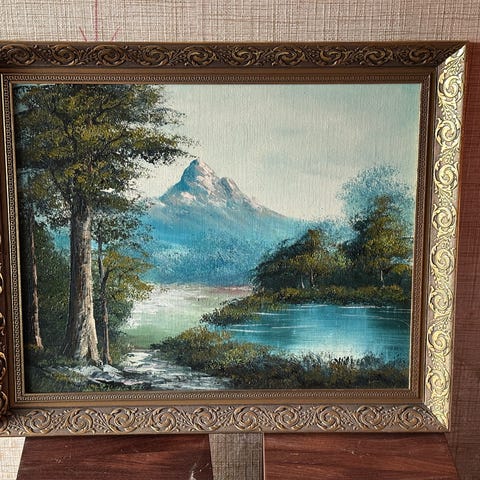 Maleri landskab med flod og hytte 90,5x51 cm