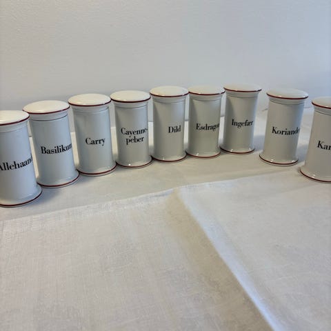 B&G krydderi krukker 8 stk. - bl.a. Basilikum, Peber sort, Vanille, Laurbær og en lille krukke til salt. Perfekt stand. Ingen revner eller skår. Sælges samlet for 200 kr.