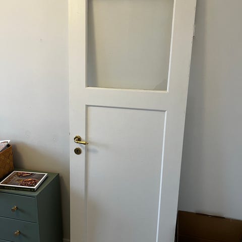 Hvid dør med glas og metalhåndtag