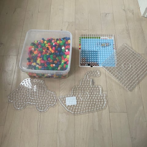Hama børnelegetøj bestående af perler i forskellige farver, perleplader i form af en dinosaur, en hest og en bamse samt tre flasker med perler i forskellige farver. Velegnet til kreativ leg og håndarbejde.