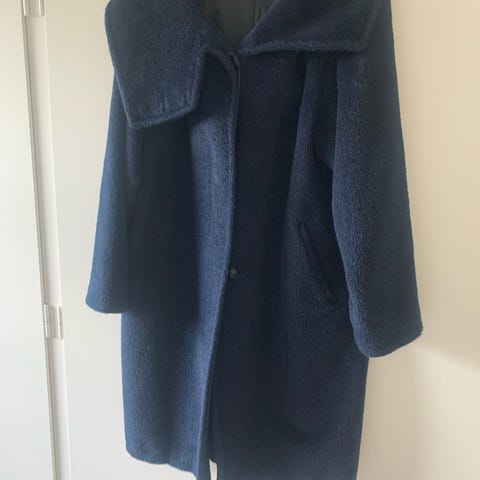 Frakken har det karakteristiske cocoon/oversized udtryk, som Max Mara er kendt for i denne periode, og fungerer både casual og mere elegant.