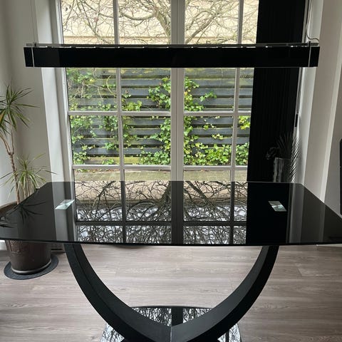 Sort bord med sorte glasplader, glasplader kan tages op så det er lettere at flytte, ligesom ben kan tages af.