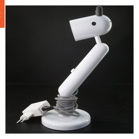 Bordlampe uden skærm, fremstillet i hvidt materiale med en ledningsledning. Lampens base har en tekstureret overflade, og skærmen har en unik foldet struktur i beige papir eller pap. Lampen har en klassisk fatning til en lys-pære. Den medfølgende skærm passer over fatningen og giver en varm belysning.