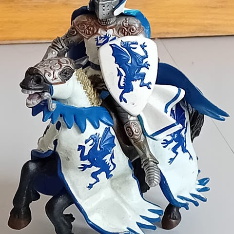 Sæt med figurer og heste i rustning fra middelalderen. Sættet indeholder flere detaljerede ridderfigurer samt heste udstyret med rustning og kappe. Figurerne er af plastik og måler cirka 14 cm i højden.