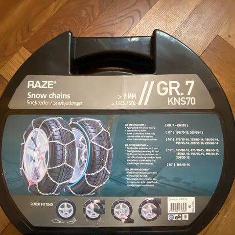 Raze snekæder til bil i en sort plastkuffert. Kæderne er af metal og farvede komponenter, der hjælper med montering. Specificeret til dæk størrelser fra 14" til 17". Hurtigmonteringssystem er inkluderet.