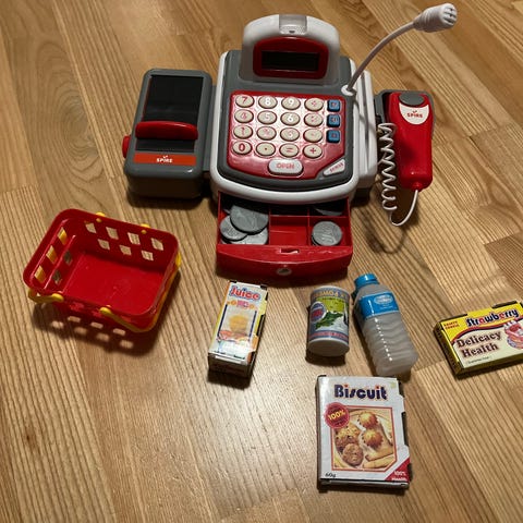 Legetøjskasseapparat i lyseblå, rød og gul med forskellige knapper og en scanner. Det indeholder en mikrofon og en legetøjsskærm med numeriske taster. Dele som kortterminal og scanner er også inkluderet. Størrelsen er 20x24 cm.