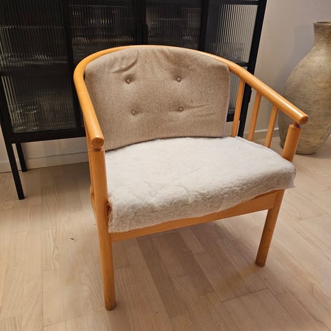 Obs. Jeg har to stole i samme model. Den anden stol er også igang med at blive om polstret i samme tekstil