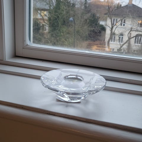Smukke fyrfadslysholder fra svenske Orrefors (det svenske Holmegaard). Modellen hedder Icecube og de er brugt en enkelt gang. Helt fri for stearin.