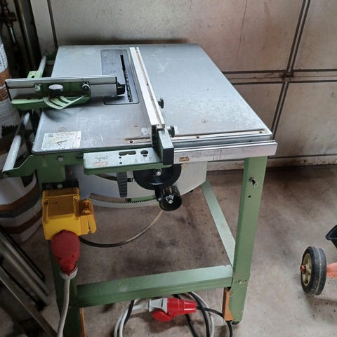 Elektra Beckum TKHS 315 C bordrundsav med bordplade i metal og understel i blå. Maskinen er udstyret med en elektrisk motor og har hjul til mobilitet. Velegnet til præcisionsskæring af træ og andre materialer i værkstedet.