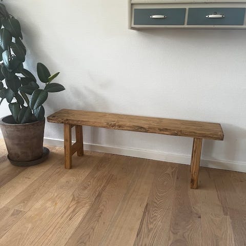 Denne bænk er lavet af 1 planke i 20, eller 25 dyb cm og smalle rustikke ben.