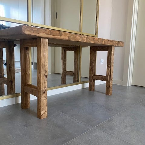 Alle møbler er håndlavet i træ og bearbejdet for at få det slidte look og herefter får det olie. Det er ikke brændt. Alle møbler er unikke og ikke to er ens