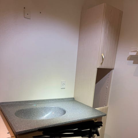 Samlet bredde for overskab er 140 cm, heraf spejl 80 cm. Skabsdybde 17 cm. Indbygget ovenlys over spejl. Bordpladen er af mærket KUMA og er 142 cm bred og 55 cm dyb. Blandingsbatteri medfølger ikke. Skab og bordplade kan evt. sælges separat. Skal afhentes.