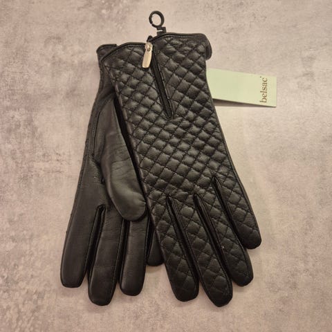 Belsac damehandske i blødt og lækkert lammeskind. Det er en meget smuk og helt enkel handske. Læderet langs fingrene, er syet sammen på indersiden, og der fremstår ikke synlige stikninger. Der er dog stukket omkring det nedre stykke af tommelfingeren, for at give en bedre pasform. Handsken er med fleece for, som både er varmt, og giver en rigtig god bevægelighed i fingrene.
