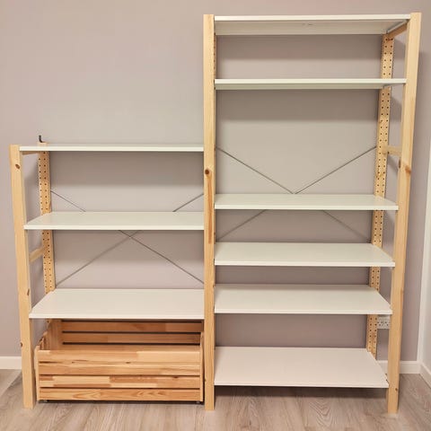 Klassisk Ivar, med en hjemmefiflet bøjlestang, som er meget funktionel. Hylderne ka flyttes rundt, og bøjlestangen kan selvfølgelig fjernes.