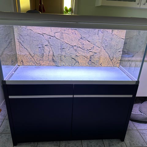 Et ældre, solidt AkvaStabil 325 liters akvarie inkl. originalt skab, Aquael Turbofilter og 2 LED-rør integreret i låget. Pænt og funktionelt setup, klar til drift.