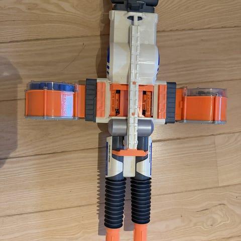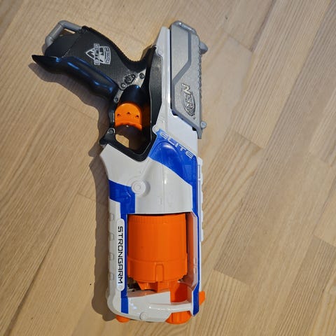 Denne genstand er en Nerf Elite Disruptor legetøjspistol, der måler 30 cm i størrelsen. Den er hovedsageligt blå, med orange tromle og detaljer samt en grå håndtag. Pistolen er designet til at affyre Nerf-dart og inkluderer en roterende tromle, der kan rumme flere dartpile ad gangen. Den har et ergonomisk greb for lettere betjening.