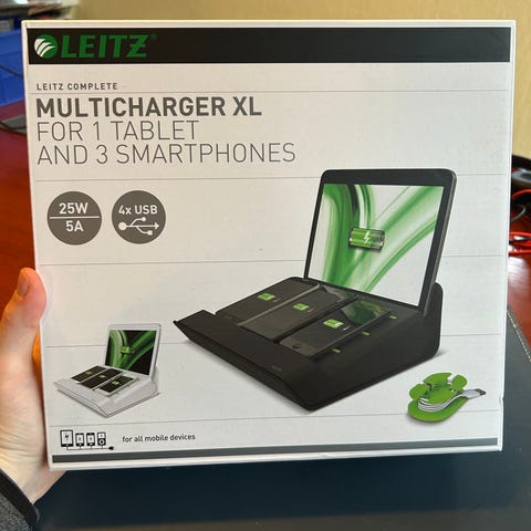 Leitz Desktop Multi-Charger til mobile enheder, designet til at oplade flere enheder samtidig. Den har kapacitet til opladning af op til fire enheder og kommer i en kasse med dimensionerne 21x25x9 cm. Produktet er egnet til både tablets og smartphones samt inkluderer mikro USB- og mini USB-kabler for at undgå kabelrod.