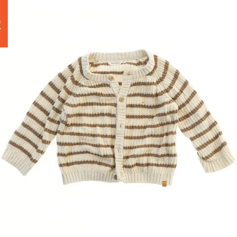 En strikket cardigan til børn med knapper foran. Den har flerfarvede vandrette striber i lilla, blå og grønne nuancer. Forsiden har to lommer, og cardiganen har lange ærmer.
