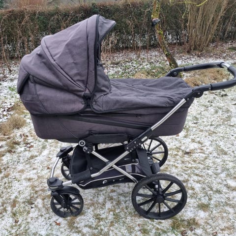 Emmaljunga barnevogn i Black lounge, dvs den er mørkegrå. Det er den store model på 98 cm. Alt er i rigtig god stand, nyvasket i neutral, så klar til brug. Alt virker. Incl. god madras, regnslag, indbygget myggenet/solsejl. Sort ny kørepose som også kan bruges i klapvogn.