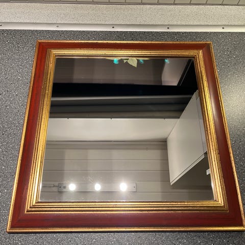 Dette er et vægmonteret spejl indrammet i træ. Rammen har en klassisk, naturlig træfærdig overflade med dekorative brune kantdetaljer. Spejlet inkluderer en indbygget knagerække med fem knager nederst til ophængning af små genstande såsom nøgler eller tørklæder. Det kan hænges op via snorene på bagsiden. Den samlede størrelse er 41x30 cm.
