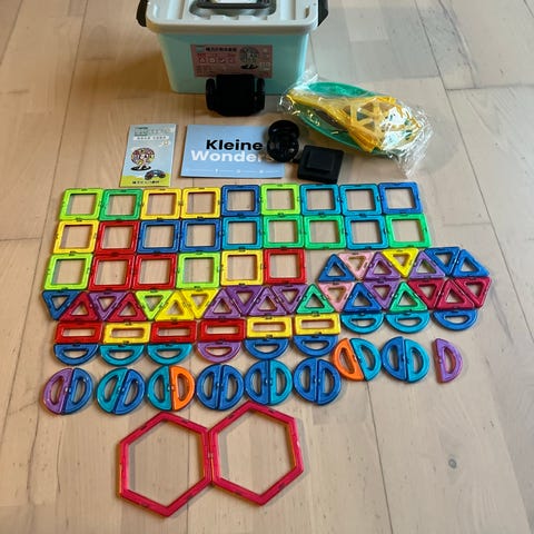 Dette er et sæt magnetiske byggesten fra Magz-Magnetic's Magnet System. Sættet indeholder forskellige farvede byggeklodser, herunder røde, blå, grønne, og gule elementer. Klodserne har forskellige former og størrelser og er designet til at være lette at samle og bygge med, understøttet af magnetisk tiltrækning. De leveres i en praktisk bærbar opbevaringskuffert, der gør det nemt at opbevare og transportere sættet.