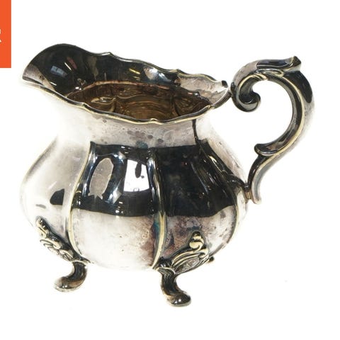 Vintage 50’er stil. Kande er lavet af metal med håndtag i snoet plast, hvilket giver et unikt og elegant udseende. Den har en diameter på 10,5 cm og en længde på 12,5 cm. Med patina, der tilføjer karakter. Velegnet til servering eller som dekoration.