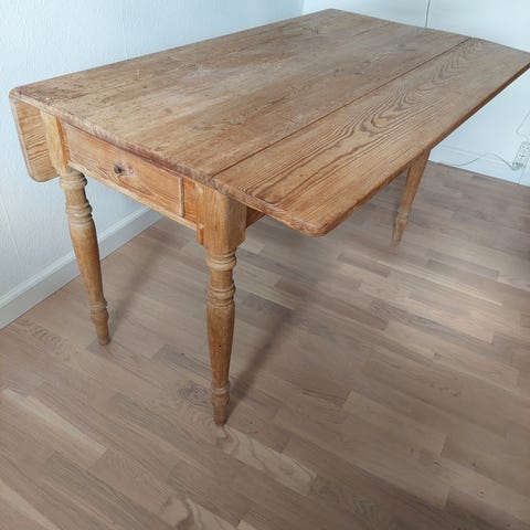 Vintage afsyret fyrretræsbord med skuffe og klapper