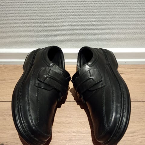 Disse sorte herresko i størrelse 44 er lavet af skinnende læder og har klassiske snørebånd. Skoene har en solid hæl og en læderbelagt sål, som viser tegn på brug. De er velegnede til formelle anledninger og kan parres med et jakkesæt eller anden formel beklædning. Tags: herresko, formelle sko, lædersko
