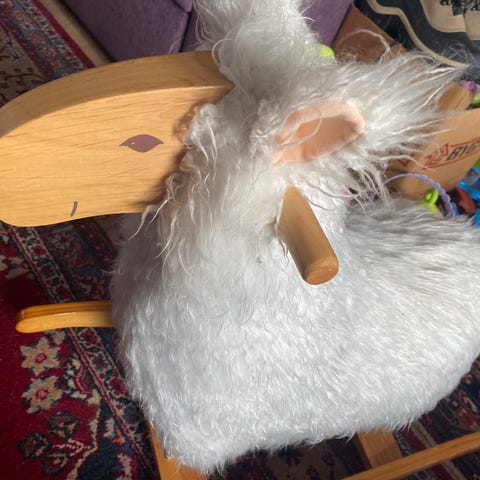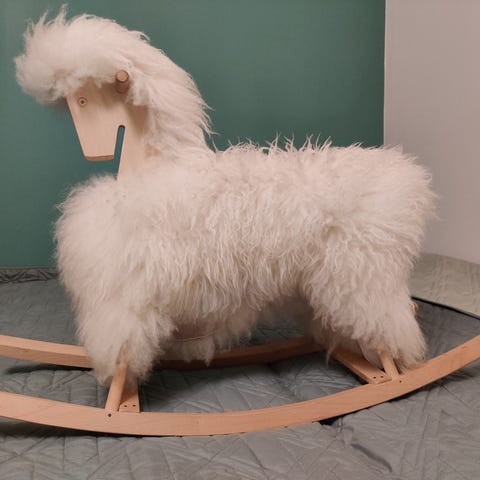 Gyngefåret, hjemme-snedkereret i træ og med rigtig uld. Rigtig fint og dekorativt og et fantastisk legetøj. 350,-. Islands Brygge